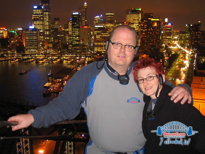 Very hard to find the check-in for the Bridge Climb. Wandered around the Rocks for a while and eventually found it. Got checked in and suited and booted. Took about 45 minutes to go through the safety and kitting out procedure and then it was out onto the Bridge. Walked for maybe 15 minutes under the road deck and then climbed four flights of very steep ladders to get out on the bridge arch itself. Very gentle walk up the bridge - stopping every few minutes to admire the view and get a bit of history from our guide. We were wearing headsets so we could hear him. Just before the summit we stopped to watch the sun go down over the Blue Mountains. Just spectacular. I could write hundreds of adjectives to describe what we saw and it still wouldn't do it justice. Got to the top in twilight and had our pictures taken and then headed down the other arch on the opposite side. In total it took about 3 hours but at least an hour of that was the safety briefing etc. Totally worth it.