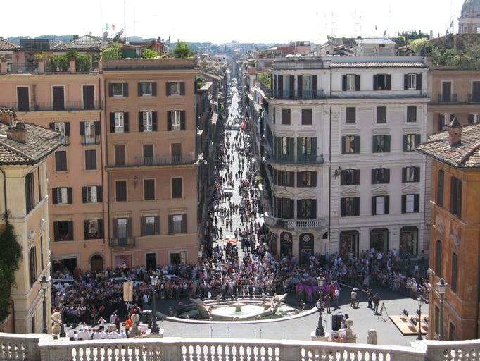 Wandered around the square at the foot of the Steps for a bit and then went off into a side street where we found an outdoor café doing some lunch. Noticed a number of TV cameras that were filming 6 glamorous looking women having lunch at a nearby café. Figured they were filming something like America’s Next Top Model. Had a nose around and spoke to the American group on the next table to us – they didn’t recognise anyone either, so it wasn’t just us!