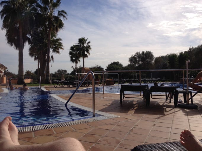 Back down to the villa to get changed for the pool and we were there and ready by 10.30. I’d bought a replacement for the swimming trunks I’d forgotten to bring and let’s just say they were snug. There were to be no sudden movements and any sort of lunge was completely out.