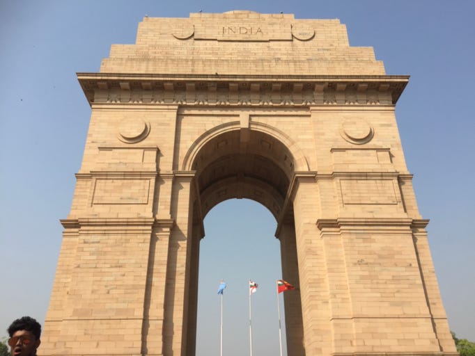 Very nice swimming pool on the 4th floor and loads of places to eat in and around the lobby. We decided to go for a walk which was easier said than done. Reception is up a long driveway which climbs about 2 floors. We trundled down it slowly and into the quiet madness of a posh part of Delhi. Within seconds of coming out of the gate, we had 4 or 5 people ask if we wanted to visit their emporium, or needed a lift, or help with the wheelchair. Politely declined and walked up towards India Gate. Didn’t FULLY get there as it was too darn hot! 35 degrees and pretty humid.