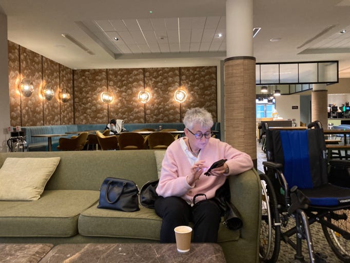 Deserted bar so we found some nice sofas and ordered some drinks and then some soup, bread, chips for lunch. Highly agreeable. They indeed do have a great view of the airport plus a balcony area with seating which we could go out on - bit cold but would be amazing in the Summer - we’ll be back!
