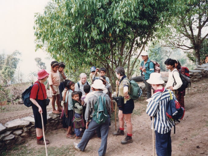 Off we went down the mountain with our Sherpas and Porters. We crossed the river plain where they grow rice and barley and we saw White Egrets and Brown Herons. We then walked into a village where Edwina who hadn’t felt well returned with her husband to Fish Tail.