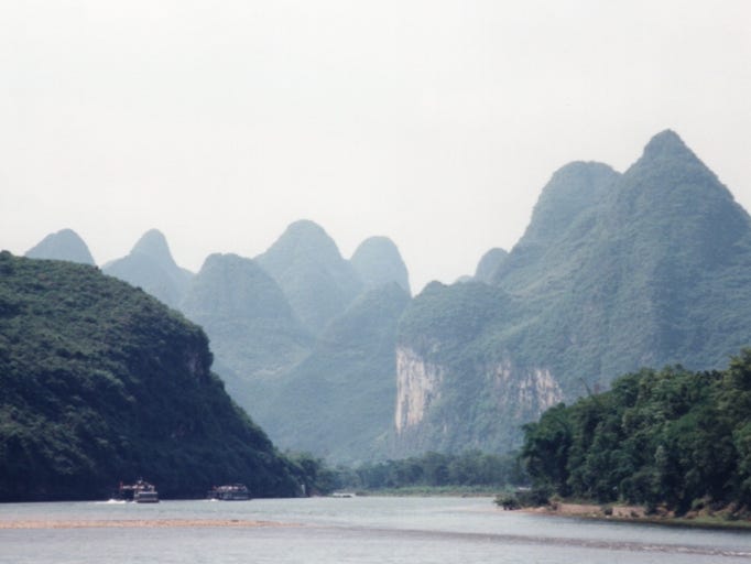 Buses to start of cruise on Li river - beautiful scenery. Farms, ducks galore - pleasant breeze - lunched on board. Water Buffalo.
