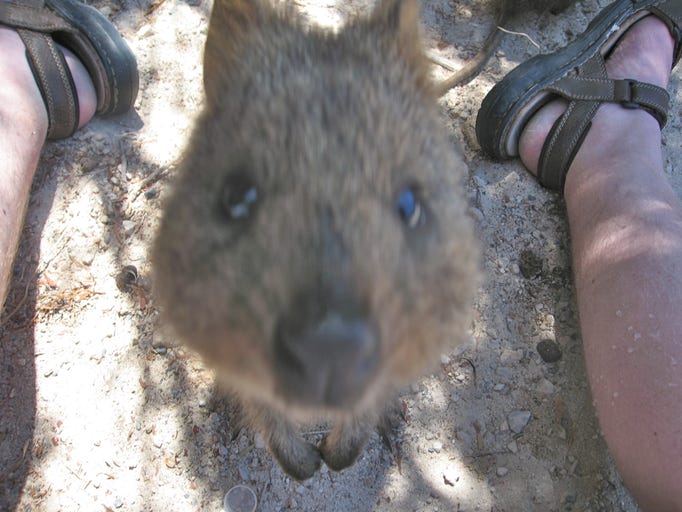 Headed back to the bike and cycled round to the next bay and saw some Quokkas on the way. Nikki headed over to them and gave them some water. Two of them crawled all over her, taking the water and trying to take the bottle!