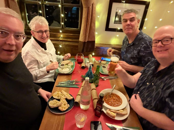 Woke Nikki and we sat and watched some Big Bang Theory before a shower and heading back down for 18:00 to meet up with Matthew. A very enjoyable hour on the sofas before the long journey across the road to the Three Magpies for dinner. When I’d booked on the Greene King app it had somehow booked it as a Festive Menu meaning I had to pay a £20 deposit. Great to arrive there and to be shown to the only table set out with Christmas decorations, Christmas crackers etc etc!! Very nice meal though and got chatting to a chap who was flying back to Las Vegas.